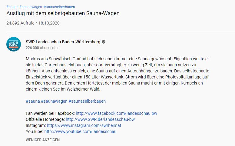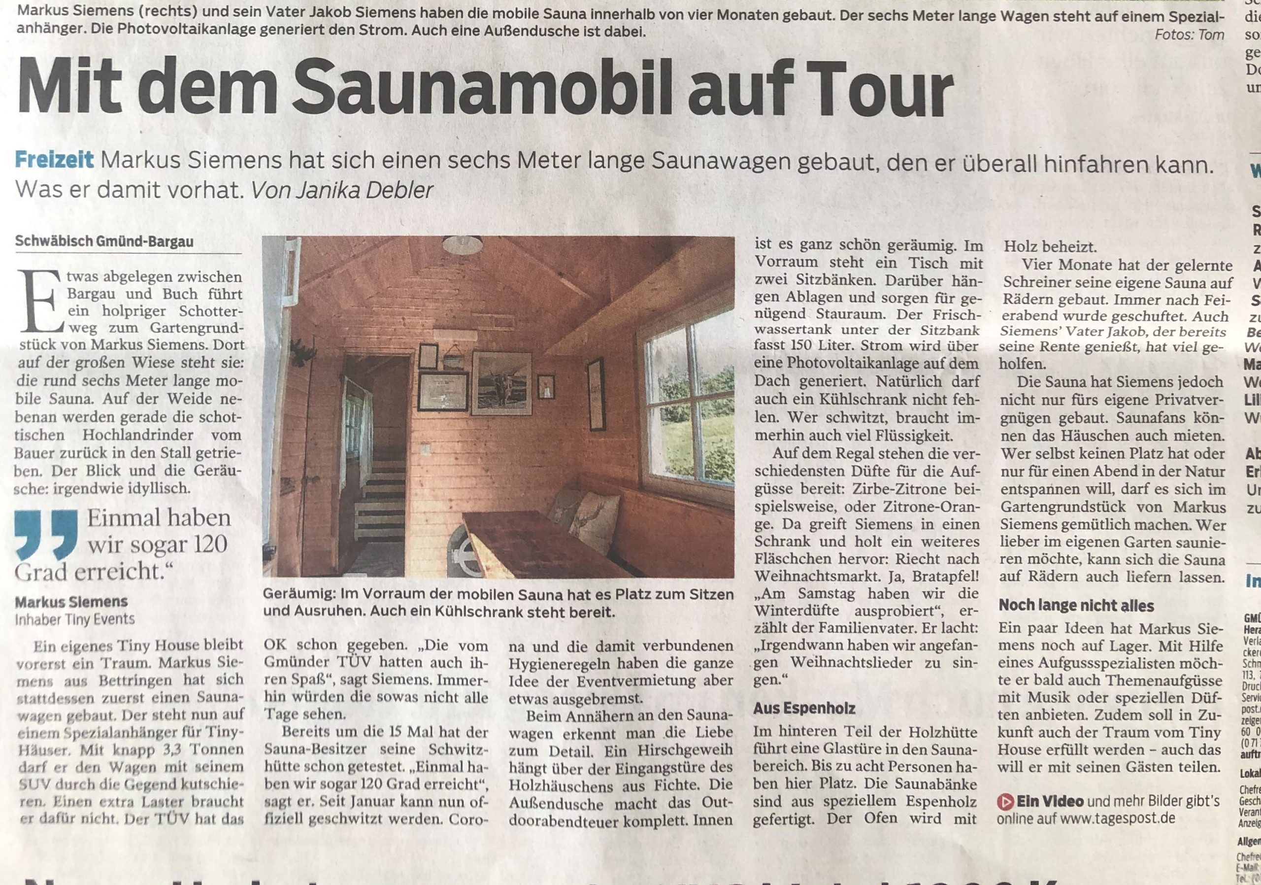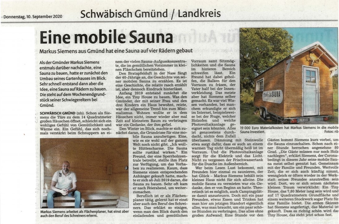Als der Gmünder Markus Siemens erstmals darüber nachdachte, eine Sauna zu bauen, hatte er zunächst den Umbau seines Gartenhauses im Blick. Sehr schnell entstand dann aber die Idee, eine Sauna auf Rädern zu bauen…. So beginnt die Einleitung des Berichts aus der Rems Zeitung. Wenn du den vollen Bericht lesen möchtest dann Klicke auf das Rems Zeitung-Logo.