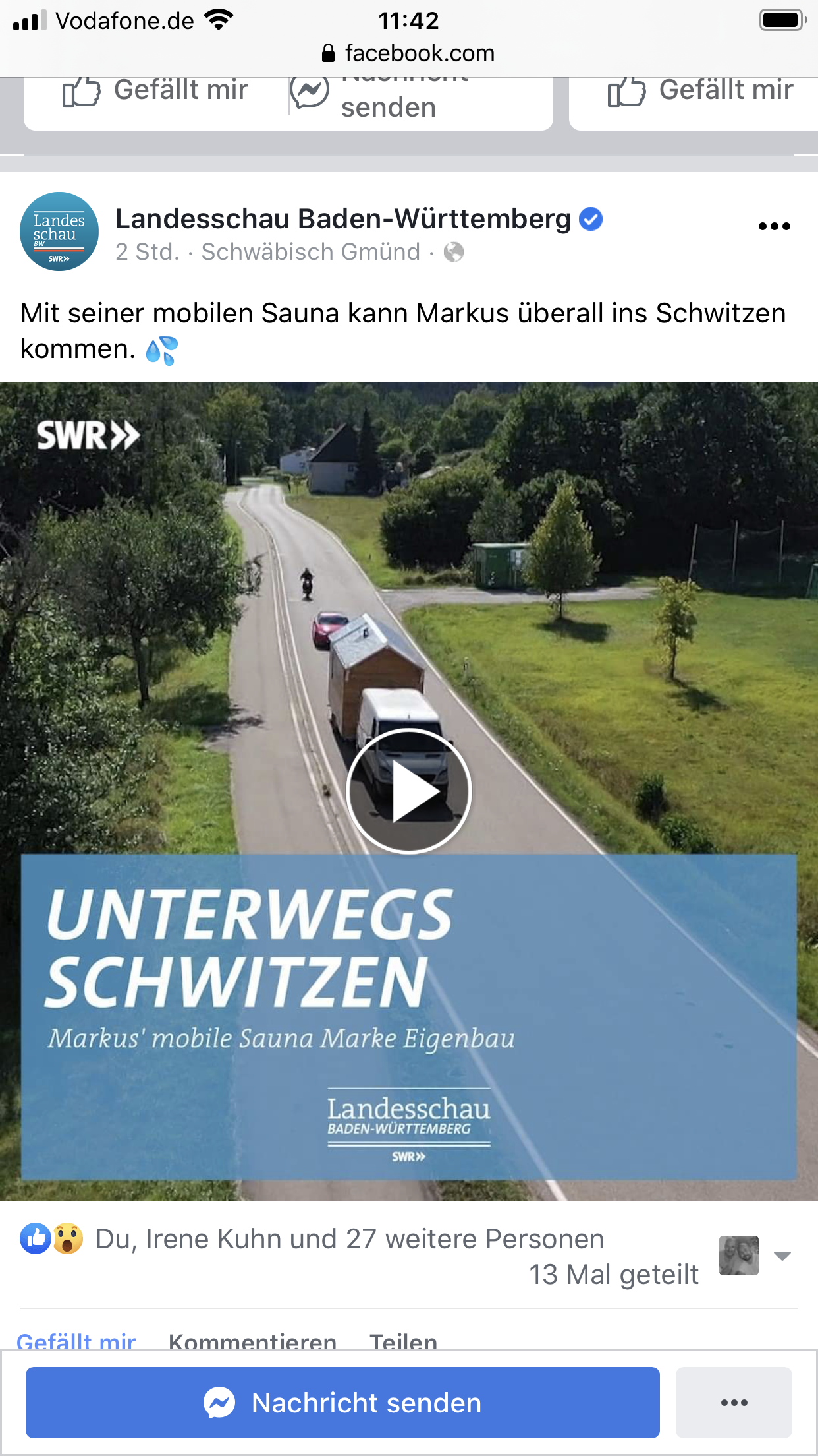 Zwei Tage lang wurden wir von einem Dreh-Team des SWR bei einem Ausflug mit unserer mobilen Sauna begleitet. Durch eine Sondergenehmigung durften wir am Rehnenmühlen-Stausee in Tierhaupten unser Lager aufschlagen. Für uns war das wirklich eine besondere Erfahrung und es hat uns sehr Spaß gemacht. Wenn du das Video sehen möchtest dann Klicke auf das SWR-Logo.